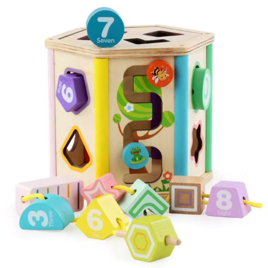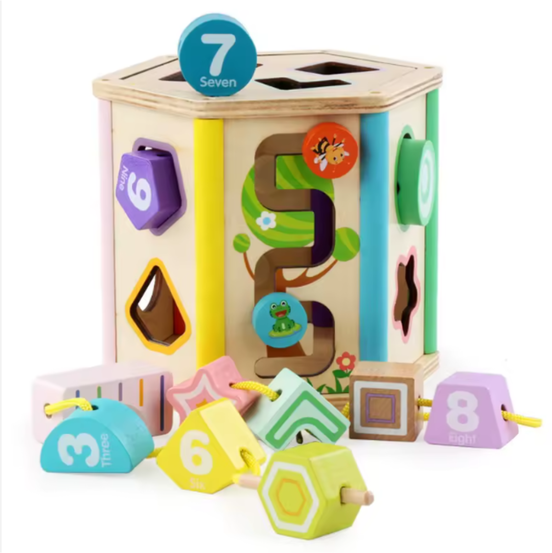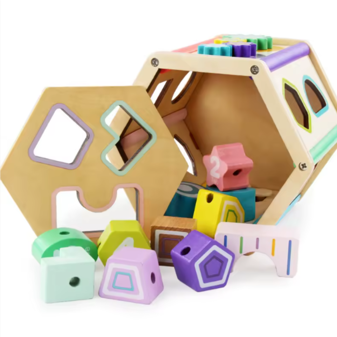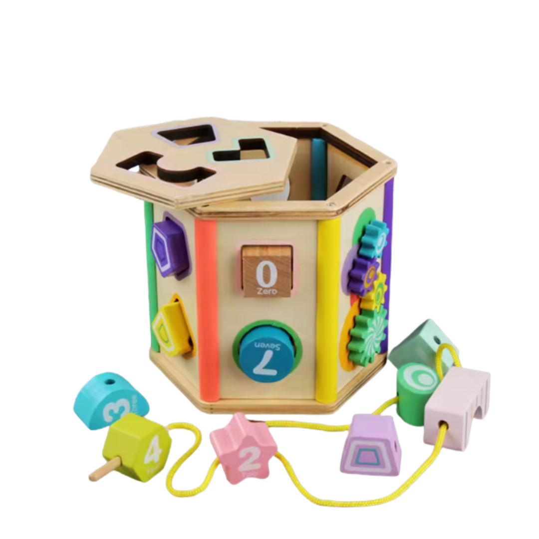 Nuestro Hexágono Encajable incluye una variedad de piezas encajables con diferentes formas geométricas, lo que estimula la resolución de problemas y el reconocimiento de formas desde una edad temprana. Los orificios en cada pieza permiten un emocionante juego de enhebrado, desarrollando habilidades motoras finas y coordinación.