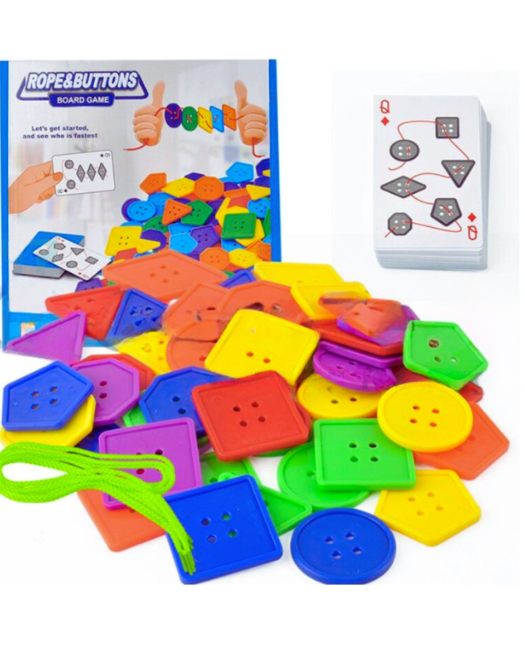 📦 Incluye: Botones con figuras geométricas de diferentes colores y tamaños + cordones para enhebrar.