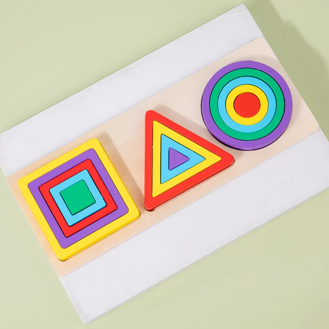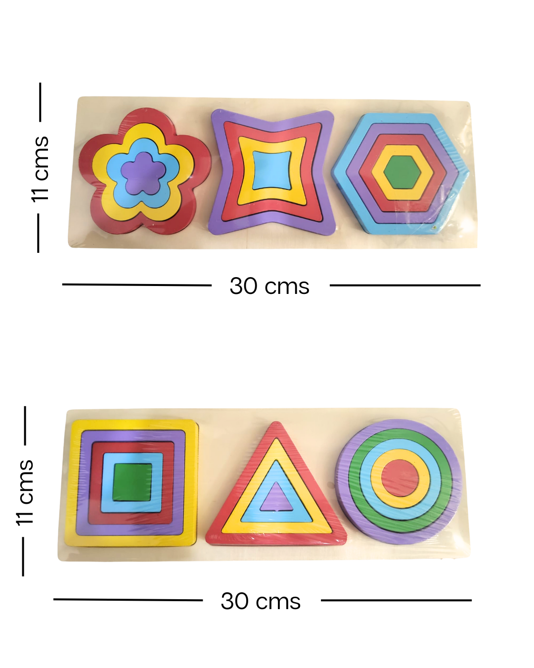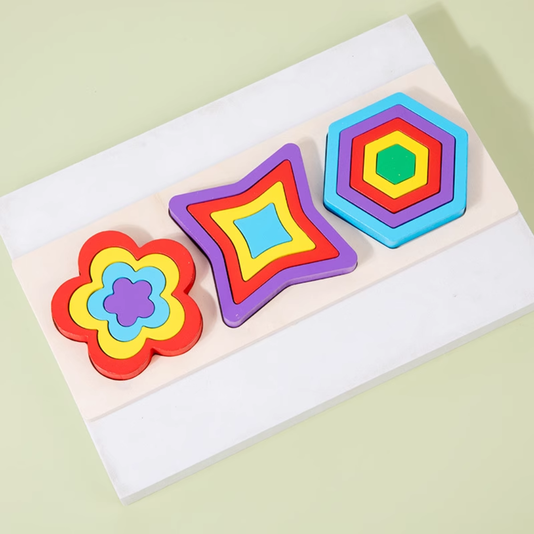 Un juguete clásico y educativo que estimula la mente de los más pequeños. Este set incluye diferentes figuras geométricas coloridas —cuadrado, triángulo, círculo, flor, estrella y hexágono— en capas 3D que se apilan y encajan sobre una base de madera.